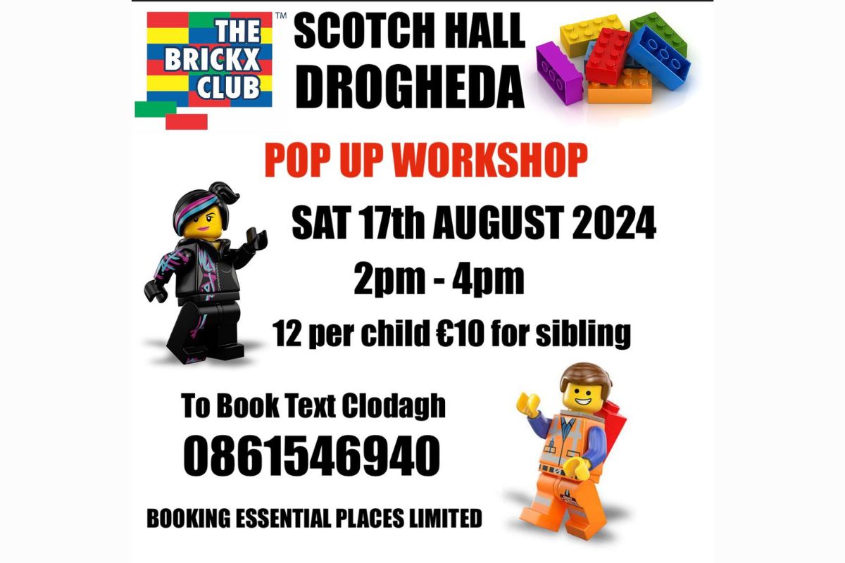 Event: LEGO Pop Up Workshop Date: Saturday, August 17th, 2024 Time: 2 PM – 4 PM Location: Scotch Hall, Drogheda Cost: €12 per child, €10 for siblings